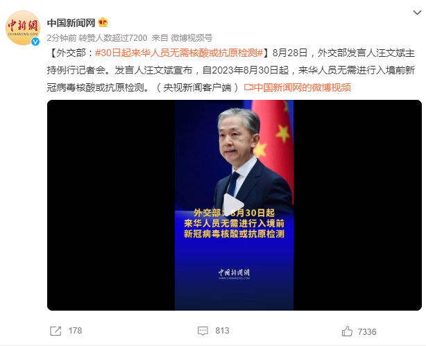 据中新网等报道,北京时间8月28日,中国外交部发言人汪文斌在例行记者会上宣布,自2023年8月30日起,来华人员无需进行入境前新冠病毒核酸或抗原检测。