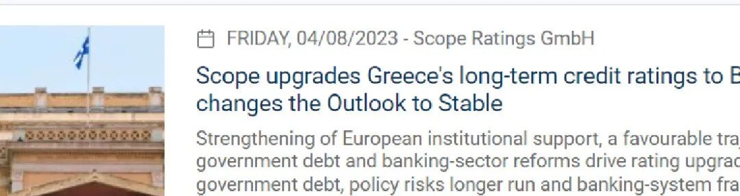 今年8月,欧洲领先的信用评级提供商Scope Ratings将希腊的评级提升至投资级。