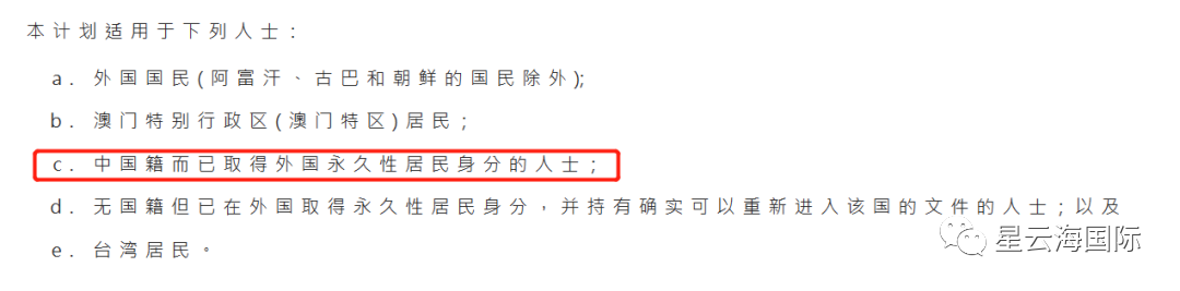 因为其计划的适用范围中包括:中国籍而已取得国外永久性居民身份的人士。