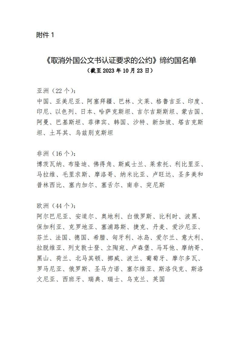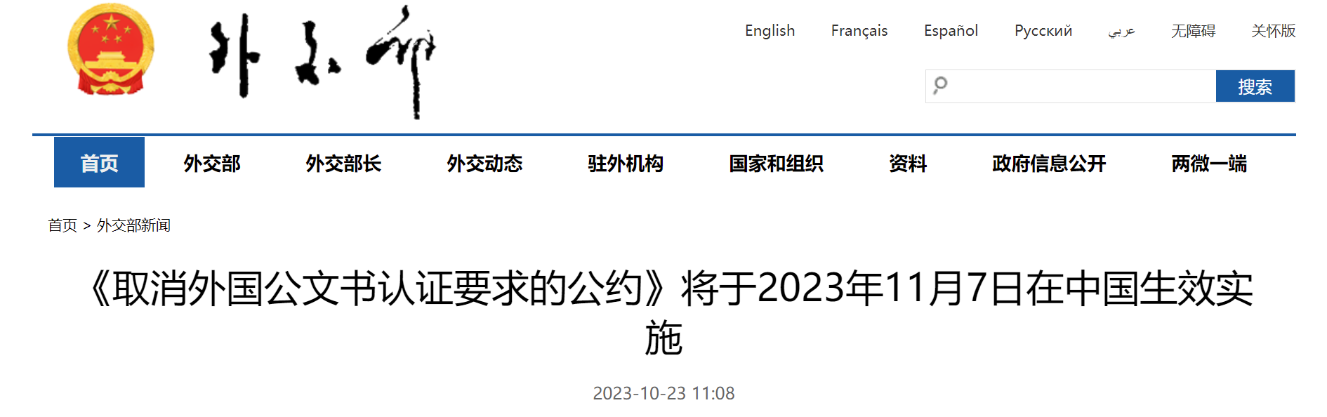 10月23日,外交部官宣《取消外国公文书认证要求的公约》将于2023年11月7日在中国生效实施。《取消外国公文书认证要求的公约》,也称作海牙认证公约或《公约》。根据《公约》,缔约国之间的文书流通,仅需办理附加证明书(Apostille),无需再办理“双认证”。目前海牙约有125个缔约国,包括欧盟各国、美国、日本、韩国、澳大利亚等等国家,约占全世界国家和地区总数的五分之三。