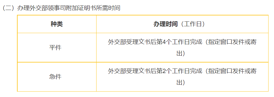 Convention de La Haye du 5 octobre 1961传统的“双认证”由于要经过外交部+外国驻华使领馆两道认证,通常花费短则一个月,长则3-4个月,文件认证周期很长。而按照目前公布的外交部领事司附加证明书办理时间,平件受理后4个工作日完成,急件2个工作日完成。