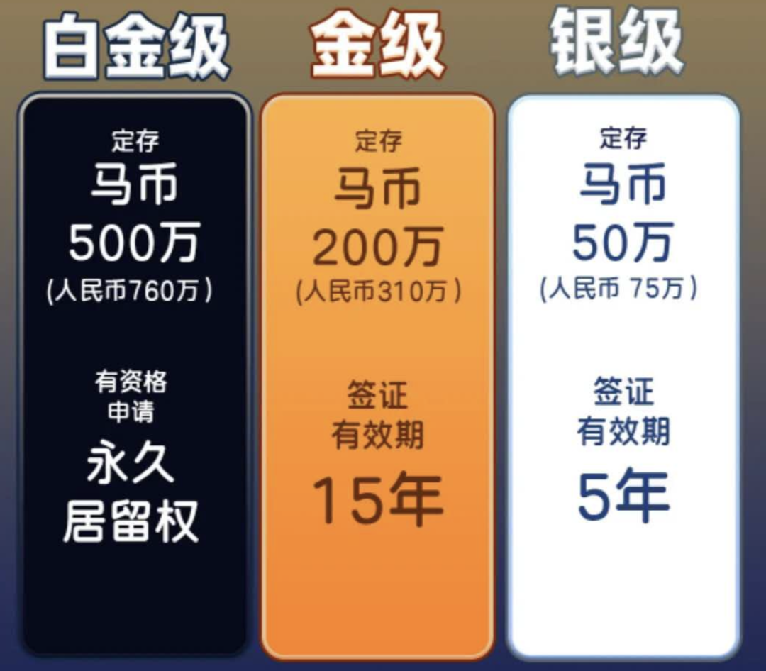2、定期存款要求分别是:铂金级500万令吉(约768万人民币),黄金级200万令吉(约307万人民币),白银级只需要50万令吉(约76.8万人民币)。