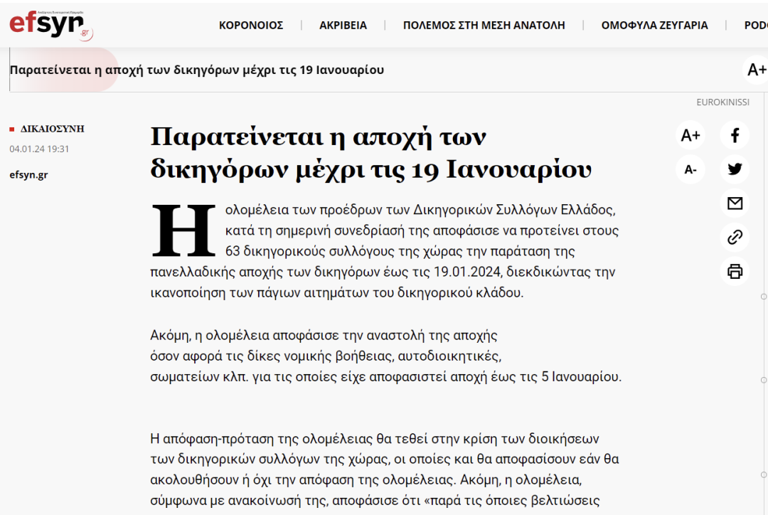另根据海外新闻报道了解到,希腊律师协会主席全体会议在1月7日的会议上决定向希腊 63 个律师协会提议,把全国律师罢工期限延长至 2024 年 1 月 19 日,并声称满足了希腊律师协会的长期要求。