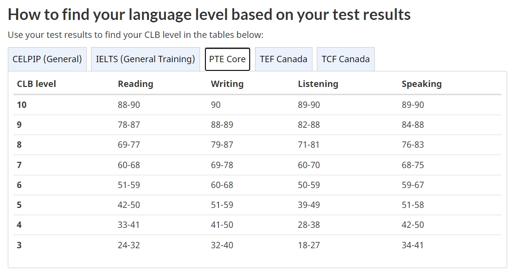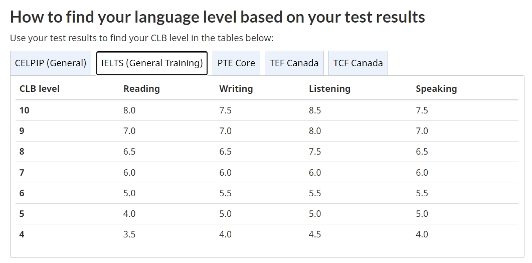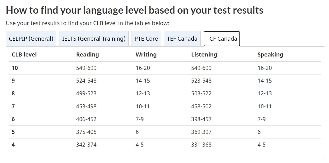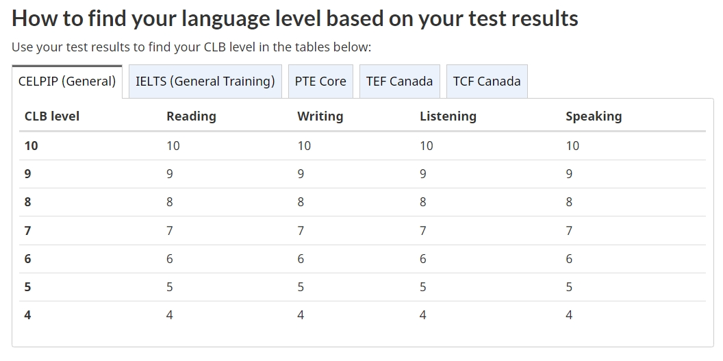 另外,为了方便衡量申请人的语言能力水平,申请人所取得的语言成绩(无论是上述哪一种)最终都会需要按照CLB加拿大语言基准水平分数进行换算。