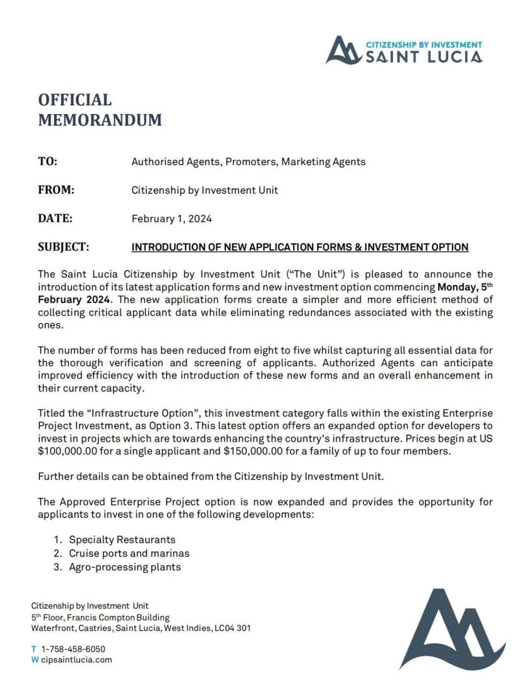 2月5日开始,圣卢西亚推出最新的申请表格和新的投资选择。新推出的基础建设项目,这个类似于之前的圣基茨新基建项目,核心就是比传统的捐赠项目便宜而且不需要融资。新的申请表数量也从之前的八份减少到五份,同时收集所有必要的数据,以便彻底核实和筛选申请人,随着这些新表格的引入,审理效率及速度会有显著提高。