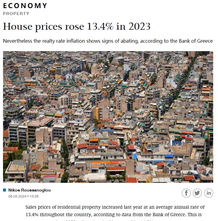 根据希腊银行周二公布的数据,与2022年11.9%的涨幅相比,2023年希腊的公寓价格上涨了13.4%。