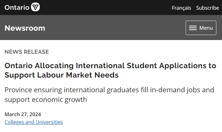 2024年3月27日,加拿大安大略省公布了其2024年的省内学签配额与“省证明信(PAL)”的分配,明确表示优先考虑公立高校留学项目!