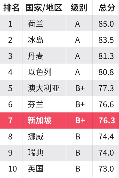 在领导力和前瞻性、强大的国家机构、财务管理,以及市场吸引力方面,新加坡排名第一;在协助提升人民方面,新加坡排名第二。