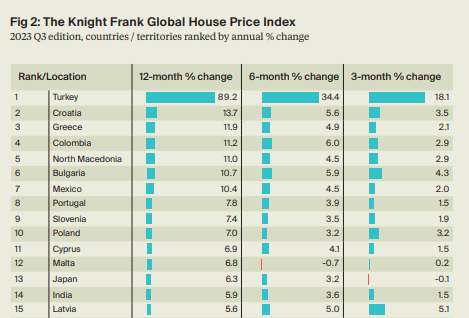 自2020年以来,土耳其已经连续三年领跑全球并再次在2023Q3排名中以年度涨幅89.2%和季度涨幅18.1%实现最强劲的增长。