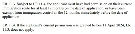 9、申请人需在同一签证路径上持有签证满一年或免于移民管制12个月,才能申请永居。但如当前签证在2024年4月11日前获得,则无需满足此年限要求。