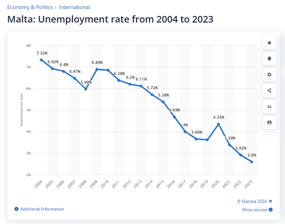 随着马耳他经济持续稳定的增长,当地的就业市场不断升温,失业率连年走低。2023年,马耳他失业率更是创新低,仅为2.6%,远低于欧盟6%的平均失业率,被认为是欧盟就业前景最好的地区之一。