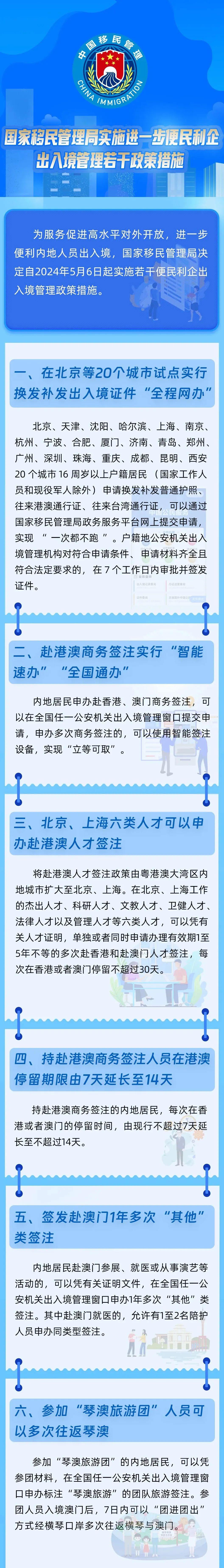 为服务促进高水平对外开放,进一步便利内地人员出入境,国家移民管理局决定自2024年5月6日起实施若干便民利企出入境管理政策措施。现公告如下:一、在北京等20个城市试点实行换发补发出入境证件“全程网办”。北京、天津、沈阳、哈尔滨、上海、南京、杭州、宁波、合肥、厦门、济南、青岛、郑州、广州、深圳、珠海、重庆、成都、昆明、西安20个城市16周岁以上户籍居民(国家工作人员和现役军人除外)申请换发补发普通护照、往来港澳通行证、往来台湾通行证,可以通过国家移民管理局政务服务平台网上提交申请,实现“一次都不跑”。户籍地公安机关出入境管理机构对符合申请条件、申请材料齐全且符合法定要求的,在7个工作日内审批并签发证件。二、赴港澳商务签注实行“智能速办”“全国通办”。内地居民申办赴香港、澳门商务签注,可以在全国任一公安机关出入境管理窗口提交申请,申办多次商务签注的,可以使用智能签注设备,实现“立等可取”。三、北京、上海六类人才可以申办赴港澳人才签注。将赴港澳人才签注政策由粤港澳大湾区内地城市扩大至北京、上海。在北京、上海工作的杰出人才、科研人才、文教人才、卫健人才、法律人才以及管理人才等六类人才,可以凭有关人才证明,单独或者同时申请办理有效期1至5年不等的多次赴香港和赴澳门人才签注,每次在香港或者澳门停留不超过30天。