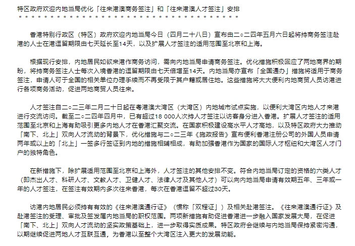 5月6日起,港澳商务签注延长至14天,增北京、上海人才签注,澳门一年多次签注!