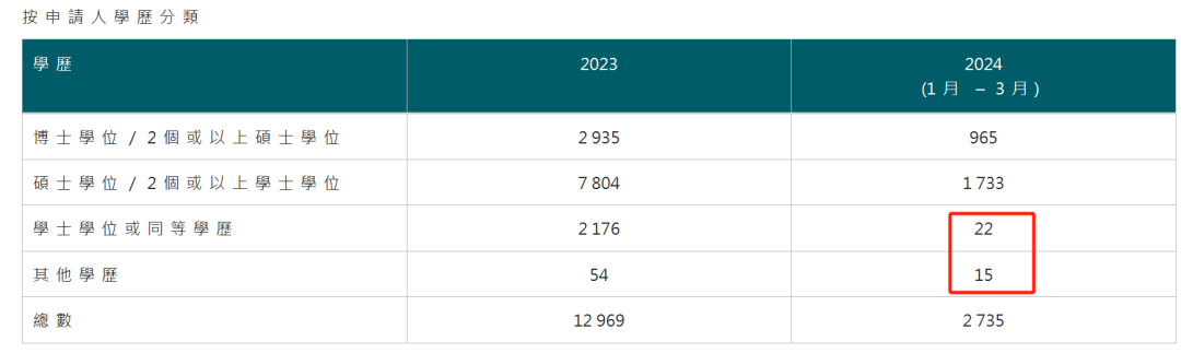 持学士学位的获批申请人只有22宗,占比仅0.8%!其他学历就更少了,只有15宗。本科和其他学历加起来也仅仅只有总获批人数的零头。