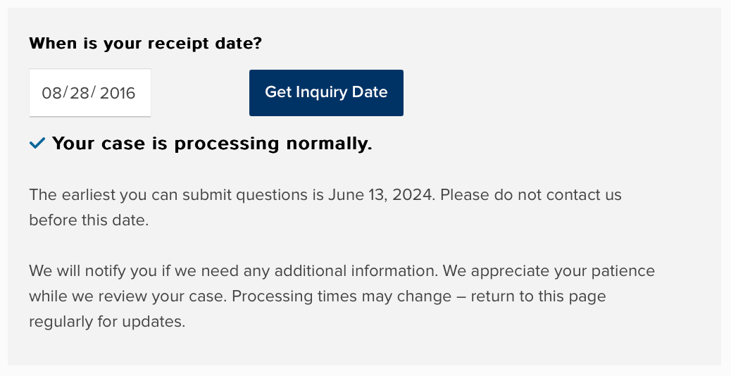 如果你的优先日在2016年8月28日,审批进度“正常”,要过一周才能联系移民局敦促审案。随着新财年表B跃进,也许接下来几个月里能看到中国的审批时长得以缩短,不过,直至目前还没肉眼可见的变化。