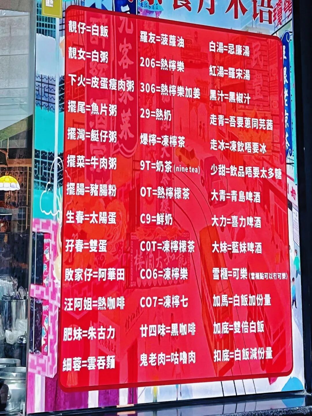 其实,在香港,这样的简写是茶餐厅特有的术语,也有人称之为茶记体。
