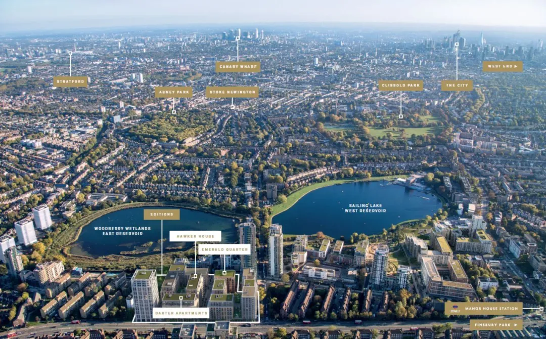 项目伍德水岸(Woodberry Down)位于伦敦北二区哈克尼,总占地64英亩,其中 15 英亩是风景如画的公园,还有开阔的水域和一个田园诗般的自然保护区!而且这个繁华的水滨社区毗邻宁静的帆船湖和芬斯伯里公园(Finsbury Park)。