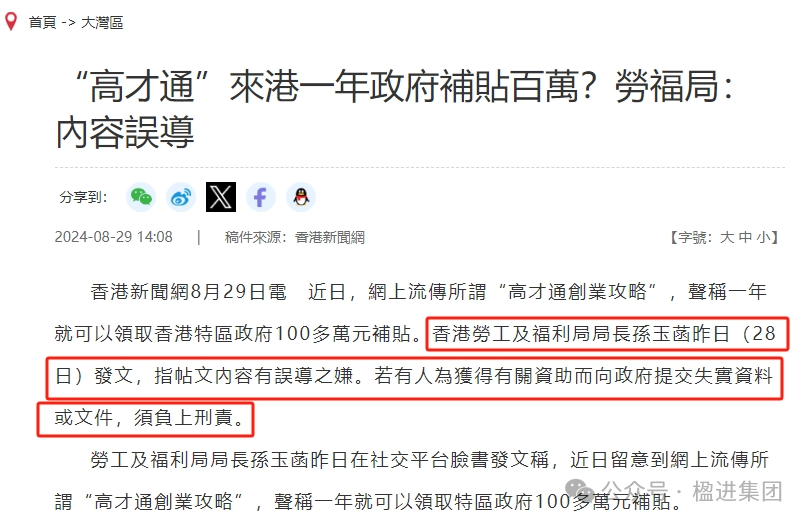 近日,小红书上流传一篇“高才通创业攻略”的文章,声称通过高才通计划在香港创业一年就可以领取香港特区政府高达100多万元的补贴。对此,香港劳工及福利局局长孙玉菡发文澄清,这些帖子内容具有误导性,并提醒公众注意,若有人为获得相关资助而向政府提交失实资料或文件,须负上刑责。