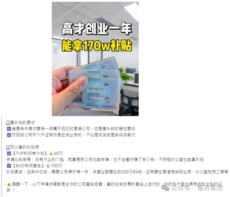 近日,内地社交平台小红书出现了一些帖子,帖子中提到如何利用“高才通”计划来港创业并领取补贴。这些帖子声称香港政府为了鼓励创业,准备了高达170万元的创业补助金。帖子中提到,想要领取补贴有两个主要条件:首先要拥有一间属于自己的香港公司,然后需要证明自己正在开展业务,无论是网店还是实体店都可以。