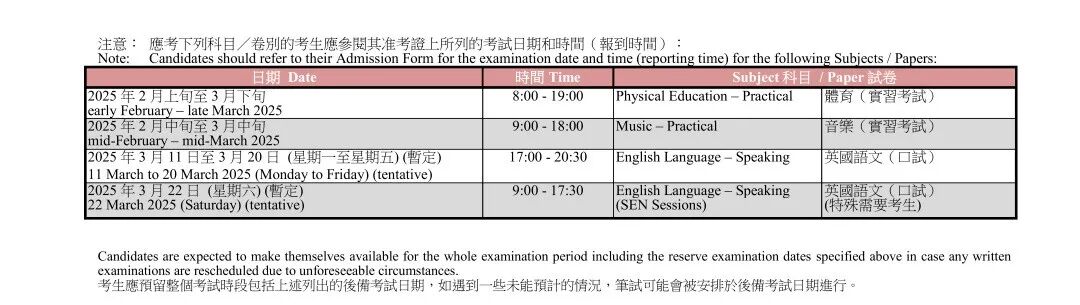 2025年DSE笔试将于2025年4月1日开始,核心科目考试将于4月2日至3日、4月5日及4月7日至8日举行。