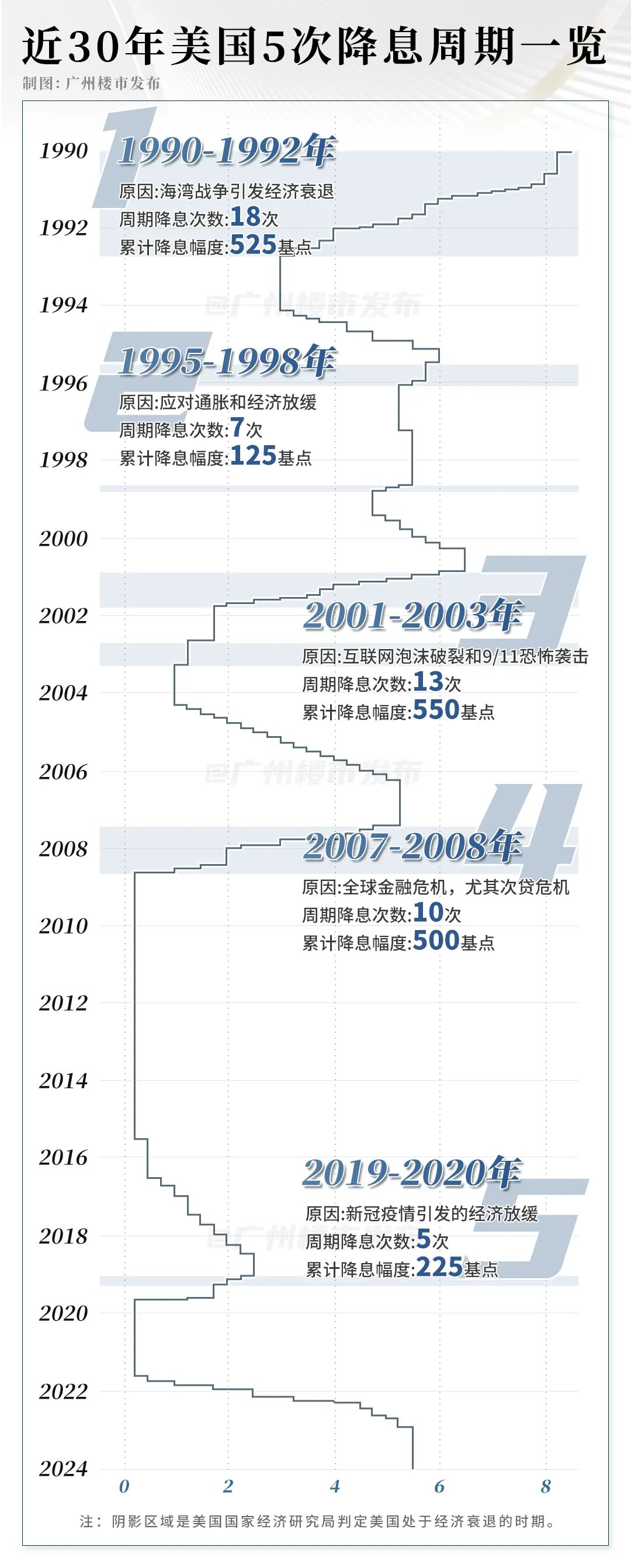 从历史上看,自上世纪90年代以来,美国经历了五轮降息周期,每次周期间隔大约三到四年,降息次数从3次到18次不等,最大累计降息幅度达到525个基点。每次降息几乎都发生在经济衰退时期。从海湾战争、互联网泡沫破裂,到2008年金融危机和2019年的新冠疫情,这些事件都与降息周期相吻合。