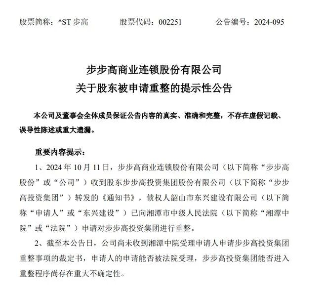 近日,步步高投资集团新增一则破产审查案件,引发了市场的广泛关注。10月11日,申请人东兴建设以步步高投资集团“不能清偿到期债务且明显缺乏清偿能力”为由,向湘潭中院申请对步步高投资集团进行破产审查。这一消息如同一枚重磅炸弹,炸响了整个零售行业,也让人们不禁对步步高这家昔日的商业巨头产生了诸多疑问和担忧。