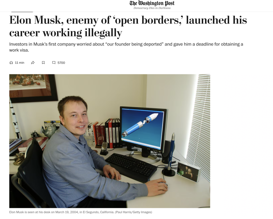 《华盛顿邮报》报道指出,1996年的一份融资协议显示,风险投资人承诺向马斯克的第一家公司注资300万美元,但协议要求他和同事在45天内获得合法工作身份,否则投资方有权收回资金。据报道,马斯克当时向同事表示自己持有学生签证。