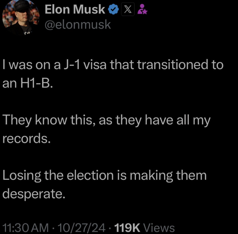 在回应支持者的帖子时,马斯克进一步透露了自己曾使用的两种签证类型,比以往公开的信息更为详细。他表示:“我最初持有J-1签证,后来转成了H-1B签证。”他补充道:“他们知道这些,因为他们有我的所有记录。选举的失利让他们变得绝望。”