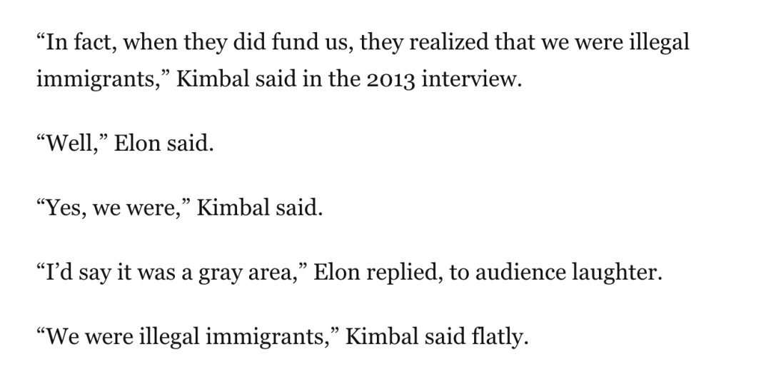 然而,他对职业生涯早期的移民身份却几乎未透露细节。马斯克的哥哥金巴尔曾表示,公司早期投资人意识到他们“是非法移民”,但马斯克对此持不同看法。