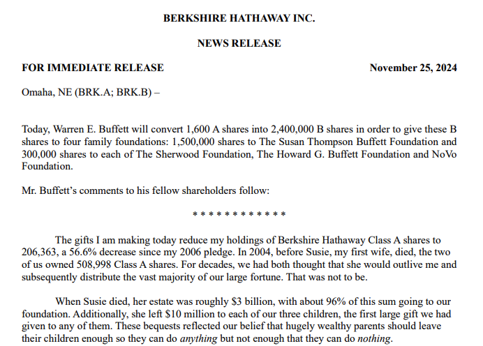 此次捐赠的具体细节与去年实施的“感恩节捐赠计划”相仿:巴菲特向以其前妻苏珊·汤普森·巴菲特命名的基金会捐赠了150万股,同时,他的三个子女的基金会则各自收到了30万股的捐赠。
