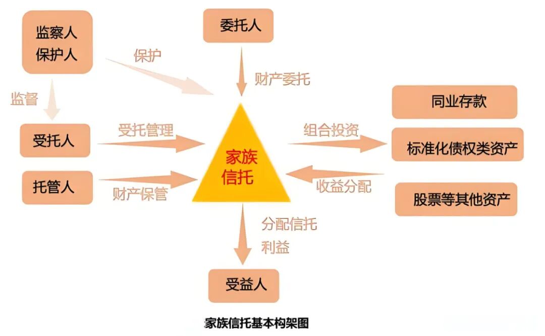 家族信托并非一个简单的产品,而是一种复杂的法律架构。它通常由委托人、受托人、受益人以及一系列资金分配规则组成。值得注意的是,家族信托中的资金并不是直接交给信托公司,而是由委托人选择一家银行开设私人账户作为托管账户,信托公司则代为管理这个托管账户中的资金。