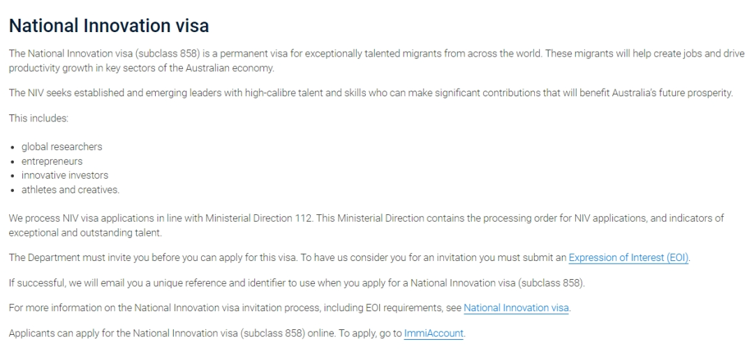 NIV签证目前已经可以正式递交申请,申请的步骤是递交EOI—获得邀请函—递交858 NIV签证申请—体检/无犯罪—预批—获得澳洲绿卡!需要注意的是:跟之前GTI的模式相似,NIV签证也需要获得在申请人领域有杰出成就的提名人或者提名机构提名,才可以申请。