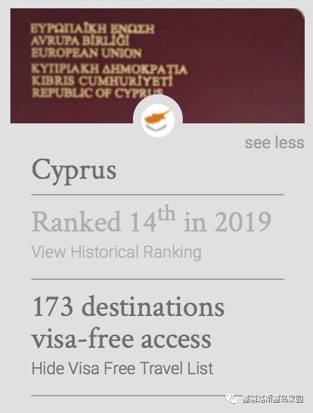 作为欧盟和欧元区的成员,塞浦路斯确保了投资者的资产安全和稳定,并向5亿多欧盟公民提供了市场准入以及贸易和税收优惠。英国知名顾问机构Henley & Partners发布的2019年亨氏护照指数(Henley Passport Index)排行榜中,塞浦路斯护照指数排名全球第14名,可以免签证入境多达173个国家和地区。