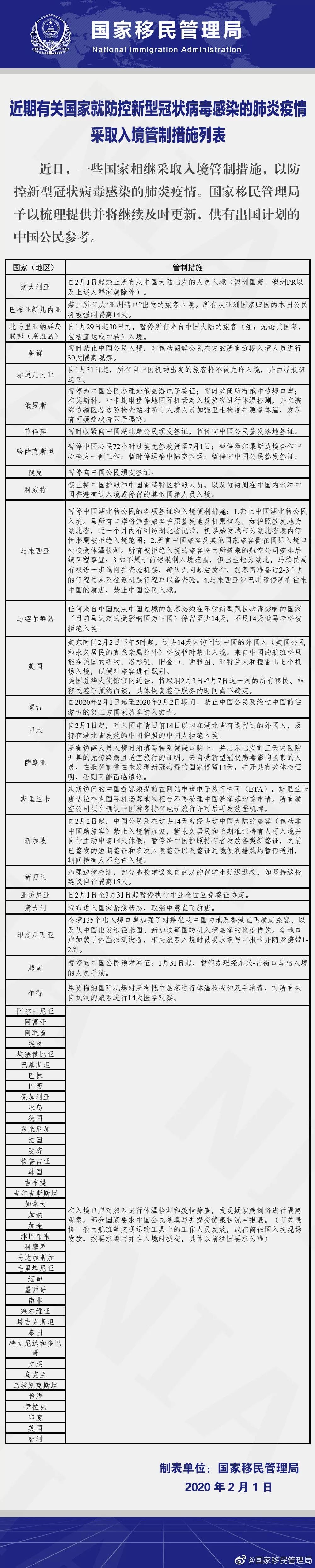 关于外国有关肺炎疫情防控的入境管制措施详情,可查看下列表格(1月31日更新)。