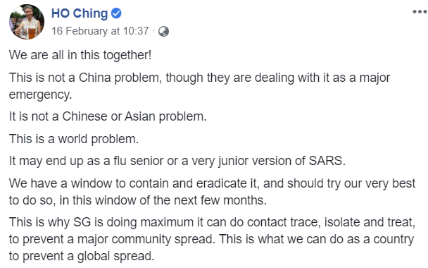 我们有消除它的突破口,并且应该在接下来的几个月中尽力而为。这就是为什么新加坡会尽最大努力做到追踪接触者,隔离和治疗,以防止社区扩散。作为防止全球扩散,这是我们的国家应该做的!