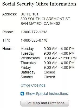 在 Google Map 搜索 Social Security Office,即找到附近的社安署办公室,Google Map 还会告诉你每个办公室的开门时间(Open Hours)。如果你不放心,可以用 SSA 官网的 Locator 工具来查找。比如说,输入加州 San Mateo 的一个 Zip Code 94401,查找后会得到如下的结果。