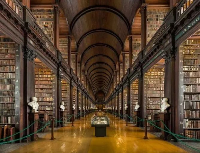 这里的图书馆是爱尔兰最古老的图书馆,建立于1592年。图书馆收藏了圣三一学院最古老的书,共有200000多册。其中的《凯尔斯经》,是爱尔兰的国宝,是公元9世紀時候的教宗图文手稿。走进这座图书馆,仿佛回到过去,一种神圣感从四面八方赶来。