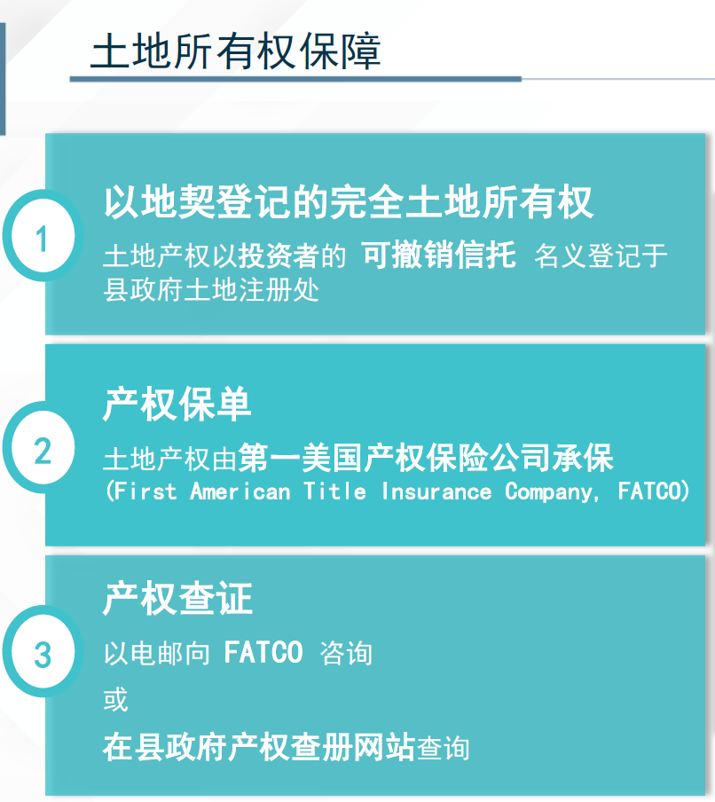 土地所有权是以地契登记地完全土地所有权,并由第一美国产权保险公司承保,产权可随时查证。