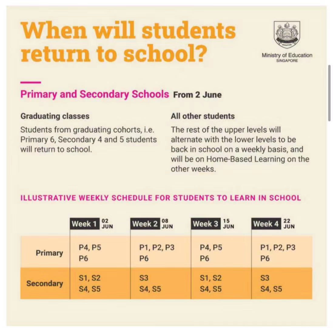 家长们最关心的就是如何复课,昨晚教育部(主管中小学等)和社会与家庭发展部(主管学前教育中心等)都发布了第一阶段的复课详情。本地小学、中学和高中将从6月2日起(也是本学年的第三学期),让学生分两个阶段重返校园。(第一阶段)6月2日起:除应届考生,其他错开上学时间小六、中四以及中五学生从当天开始,周一至周五都回到学校上课。小四、小五、中一和中二的学生则将在第一周和第三周返校,第二周和第四周继续居家学习;小一、小二、小三以及中三的学生则将在第一周和第三周继续居家学习,第二周和第四周返校。(第二阶段)在几周之后:配合全国层面的进一步放宽,允许所有学生从周一至周五都回到学校,全面复课注意:在第一阶段师生上学必须戴口罩,激烈的体育运动除外。安全距离、错开上课时间、定时量体温等措施将会被实行。这个月底和下个月中举办的剑桥A和O水准部分科目考试将照常进行,身体不适者不能参加,参加考试也需要戴口罩。社会及家庭发展部长李智陞也宣布了学前教育的复课计划:大家都知道目前所有学前教育中心的职员都在逐一接受检测,复课后,学前教育中心(幼儿园)也必须遵循一系列安全管理措施。其中包括: