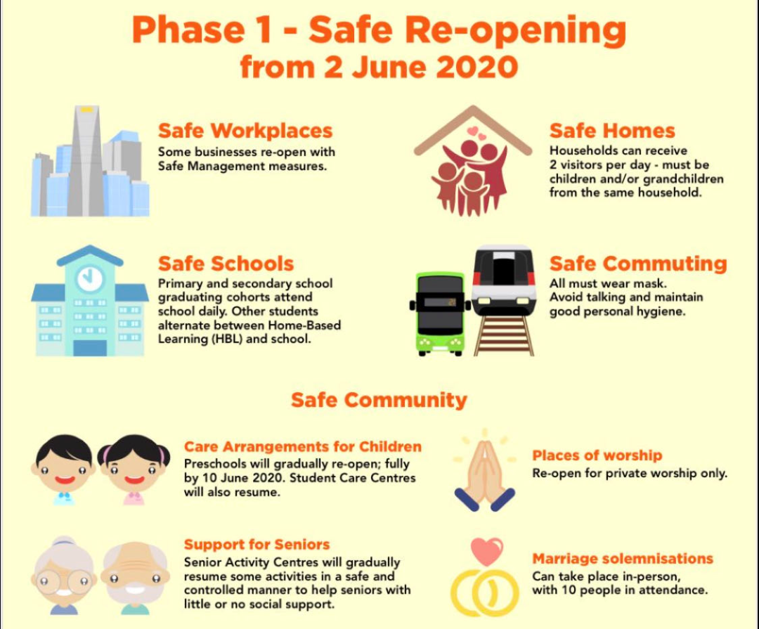 不但上文提到的,工作场所和学习场所要戴口罩之外,只要出门就必须戴口罩。交通方面,地铁和公交车增加服务趟次,乘客要避免在乘搭公共交通工具时交谈。另外,当兵的哥哥们注意了,全职服役人员的基本训练从5月26日就开始逐步恢复。之前因阻断期中断的大约1700名新的服役人员,也会在下星期二到下个月8日之间报到。老年活动中心也会谨慎逐步地开放,不过当局还是呼吁易感的年长人士,尽量多呆在家。现在子女、孙子女允许探访老人,不过每次访客仅限2人或以下。虽然从6月2日起,我们可以逐步复工复课了,还可以烫头发,生活恢复了很多。