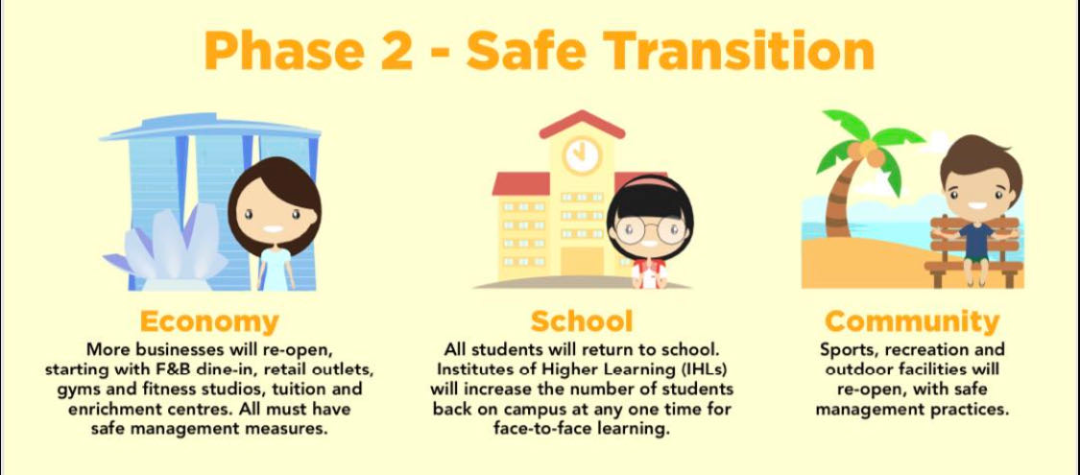 6月2日开始,允许更多关键且低风险的经济活动重启,学生也将分批回校上课。(详情见下文)高风险活动如零售业和娱乐业也暂时不会恢复,很多现行措施则将延续,包括禁止非必要活动和社交聚会。那么第一阶段会持续多久呢?颜金勇表示大概是两个病毒潜伏期,也就是持续4至6周。假如第一阶段社区传播率维持低水平、客工宿舍疫情也继续受控,新加坡会进入第二阶段。第二阶段就是进一步放宽,那个时候才会允许堂食和更多零售店开门,以及小规模社交活动,还会考虑重开体育馆。最后进入第三阶段,但也不会是像疫情前那样了。颜金勇部长说大家可以理解为疫情后期的新常态。很多场合依然会实施人数限制和安全距离措施。一些基本预防措施还会保持,像是个人卫生和戴口罩等。了解三阶段后,大家当然最想知道的是具体怎么复工复课?