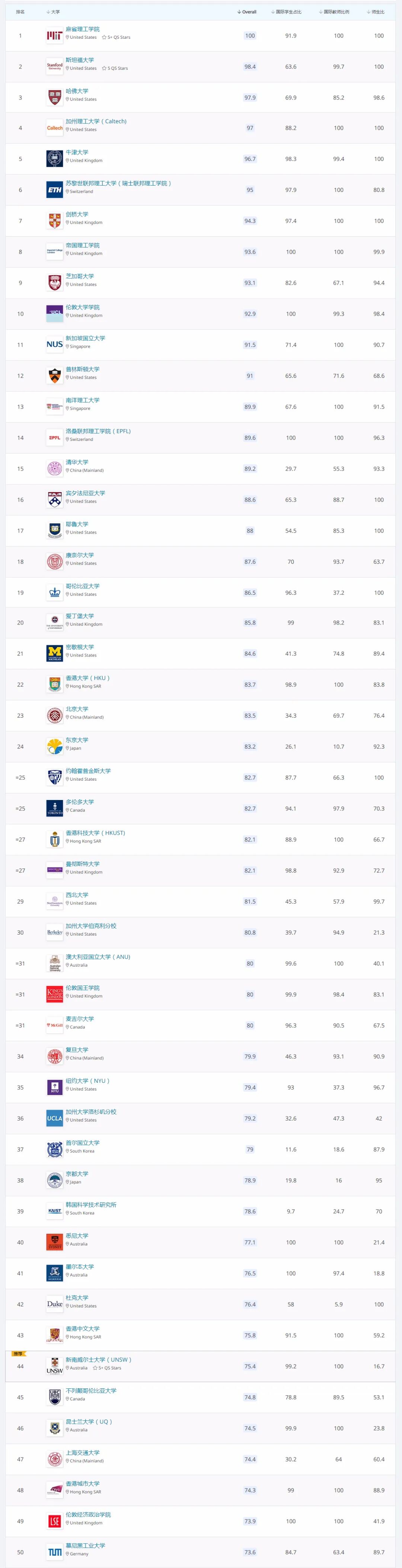 6. 国际学生比例5%:它衡量的是大学中非本国学生的比例,这也可以表明大学吸引世界各地人才的能力。