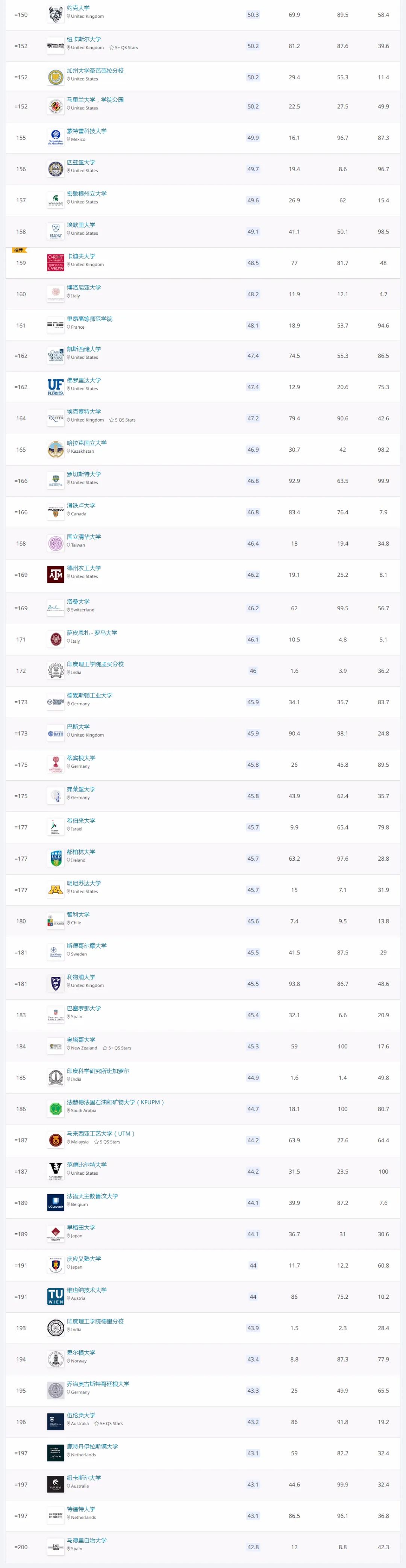 美国153所参与本次排名的大学中有112所排名小幅下降,34所排名上升。这主要是由于美国大学在QS的“学术声誉指标“和“单位教员论文引文数指标”得分的集体下滑。但整体来看,美国仍然是排名和上榜院校领先的国家;