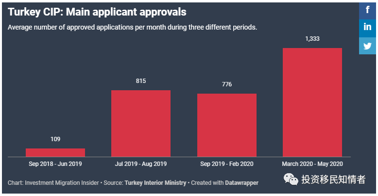 移民市场受到疫情影响导致一片萧条,但是有一个国家的移民项目反而得到了增长,这就是土耳其投资入籍计划。土耳其内政部最近的一份声明显示,在3月到5月的3个月时间里,该国归化了超过4,000投资者,也就是平均每月1,333名,这一数字是同期世界上其它各个投资入籍计划加起来的两倍以上。