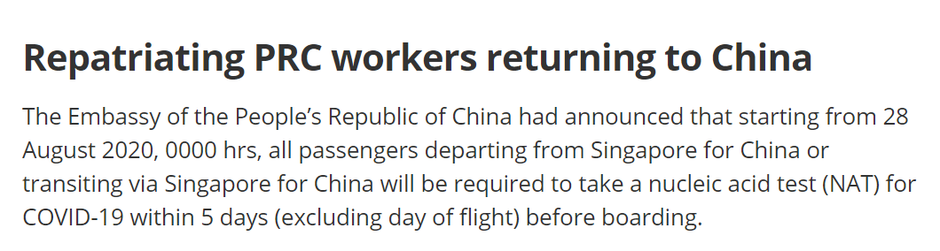 8月28日,中国对新加坡入境者正式要求凭核酸检测登机的第一天。首批通过本地核酸检测并拿到了中国大使馆的批准的47名乘客,搭乘中国国际航空公司的CA768航班从新加坡启航去杭州。第一拨人:9月1日前出发的,由于时间紧迫,无需申请,航空公司/MOH发信安排检测地点,或者凭机票前往裕廊区域检测中心。回国第一步:申请检测