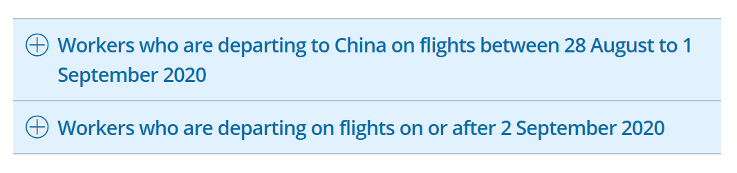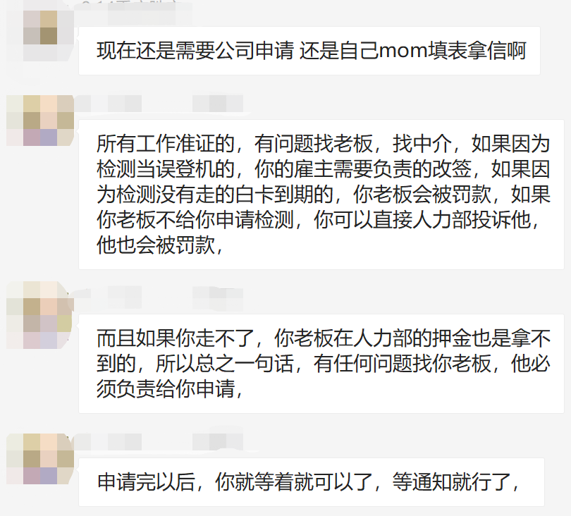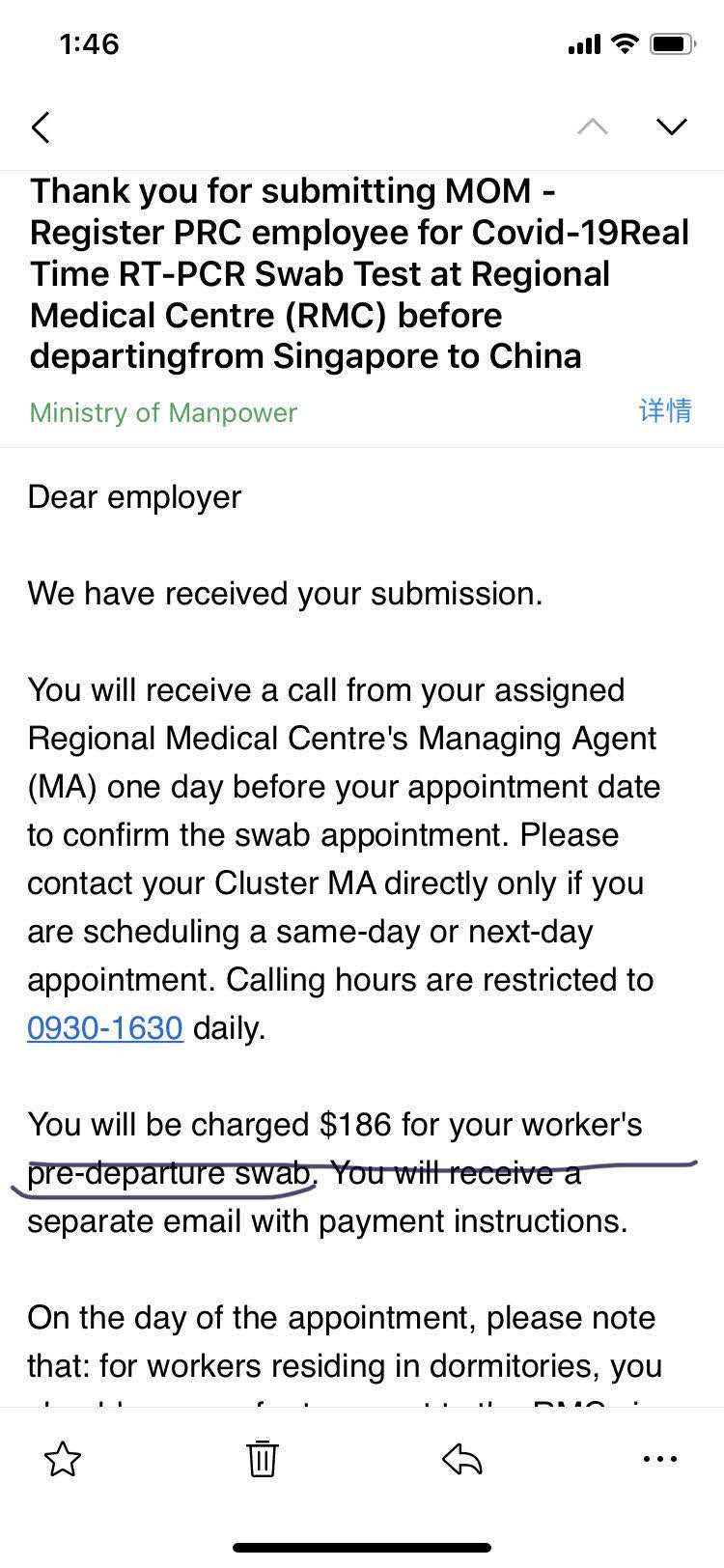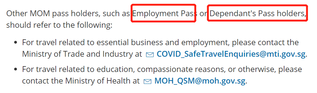 持人力部颁发的工作许可(Work Permit)、技术准证(S Pass)、特别准证(Special Pass)的人员向人力部申请最初卫生部给出的联络网址是www.mom.gov.sg/feedback。很多人表示搞不明白怎么填写,后来8月27日人力部又有了更新规定,WP、SP离开新加坡的检测应该由雇主来申请,详细查看人力部网站▼https://www.mom.gov.sg/covid-19/sending-workers-home#repatriating-prc-workers-returning-to-china细节我们在这里不贴了,请雇主或者中介详细查看人力部网站。总之,9月2日之后持有WP、SP和特殊准证的,全部找老板或者中介帮你申请安排检测。另外,在人力部的信中提到,检测的费用约S$186新币也是由雇主方面承担的。人力部的网站也提到,EP持有者和DP持有者,也应该根据自身情况写邮件给贸工部或者卫生部。商务及工作需要旅行找新加坡贸工部申请,邮箱:COVID_SAFETRAVEL_IST@mti.gov.sg教育、人道事由还是其他情况请向卫生部申请,邮箱:MOH_QSM@moh.gov.sg小楹收到很多留言,什么留学生怎么办、长期准证怎么办啊、新加坡公民怎么办啊?不能归为第一、第二的情况,统统找卫生部就对了。注意,邮件中必须要全面说明你的个人情况和你现在回家的必要性(例如:登机时间紧张、准证到期,或者有什么特殊情况要回去处理)。据说前两天写邮件申请检测的,基本上都已经收到了批准了。收到批准信后,信中会有附带检测地址的附件文件,登机前5天内到信中指定检测机构,完成核酸检测。