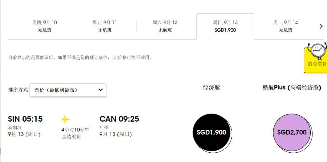 票价方面,9月13日,新加坡飞广州酷航经济舱票价为S$1900, 高端经济舱为S$2700。
