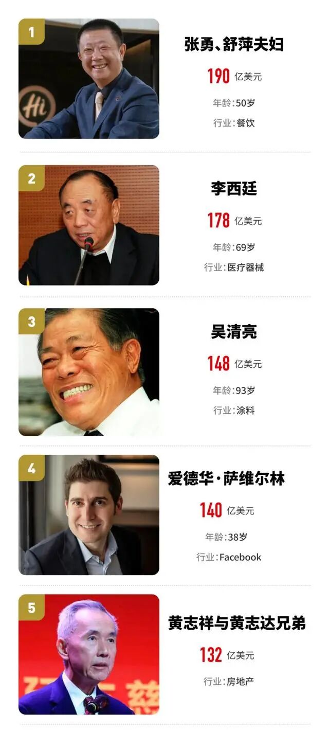 值得一提的是,今年的榜单中迎来两个新面孔,迈瑞医疗(Mindray Bio-Medical Electronics)的联合创始人兼董事长李西廷,以及冬海集团(SEA)首席执行长兼创始人李小冬首次入榜,分别排名第二和第七位。今年首次上榜就直接拿下亚军的李西廷,身家为178亿美元。他掌管的迈瑞医疗在中国深圳上市,该公司的股票在冠病疫情期间大受投资者追捧,李西廷的个人身家也随之上涨。另一名新上榜的富豪李小冬,以71亿美元的身家进入10大。他在2009年创立的冬海集团于2017年在美国上市。集团旗下的主要业务有电商平台虾皮(Shopee)、电子游戏平台Garena,以及数码金融服务网络SeaMoney。中国新移民斩获了今年前5大富豪的近一半,也是令人十分惊喜。而其他几位,应该都是老面孔了第三名是亚洲最大油漆制造商“立时集团”(Nipsea)创办人吴清亮,身家为148亿美元。