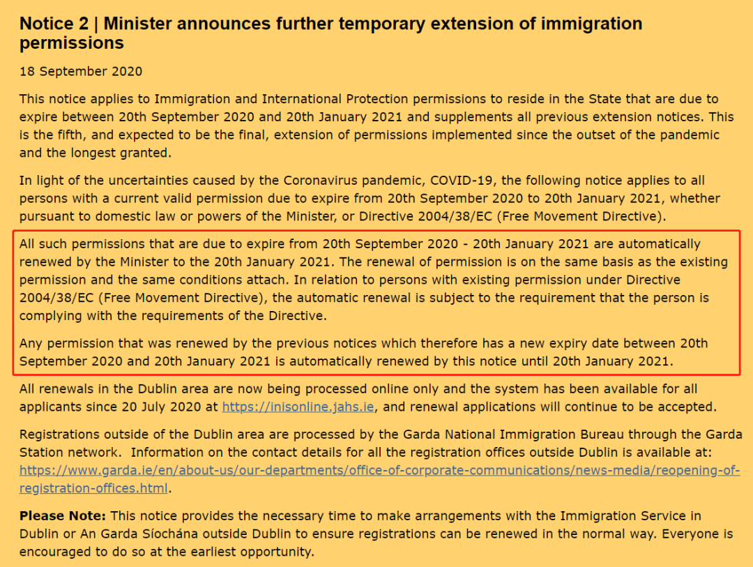 爱尔兰司法部部长海伦·麦肯特宣布,对9月20日至2021年1月20日之间到期的签证进行短暂延期。此次延期至明年1月20日,这次延期同样适用于已经延长过的签证持有者。