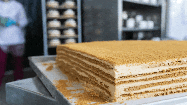 俄式蜂蜜蛋糕是一种多层蛋糕,由蜂蜜、鸡蛋、面粉、牛奶等原料制成。首先将多种原料充分搅拌揉成面团分别制作每一层蛋糕坯,然后将打发的奶油抹在烤好的蛋糕坯上,层层叠加起来。最后撒上蛋糕坯边角打成的碎屑。